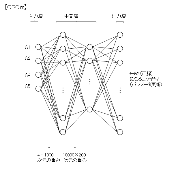 【CBOW】よくある説明に従えば、W1,W2,…W10000の1万単語がある場合、それぞれWNはN番目の要素が1,他の要素が0のベクトルをone-hotベクトルとします。そして、2層の中間層があるニューラルネットワークで、1層目を10000次元(単語数の数)、2層目を200次元(数百程度にするのが一般的)にし、1層目の重みはすべて1とします。